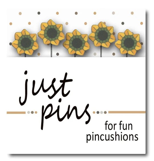 Handmade JABC button slice mounted on a stainless steel sewing pin. Assortment of five, packaged in a paper folder. Use to embellish pincushions.