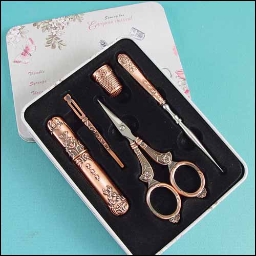 Copper Color Scissors Gift Box Set. This ornate set of 4″ embroidery scissors comes with a matching needle case, thimble, awl or sharp laying tool, and a bodkin which is handy when threading ribbon or tape into a finished piece. All packaged in a metal gift box. Overall gift box dimension is 3½” x 6″.